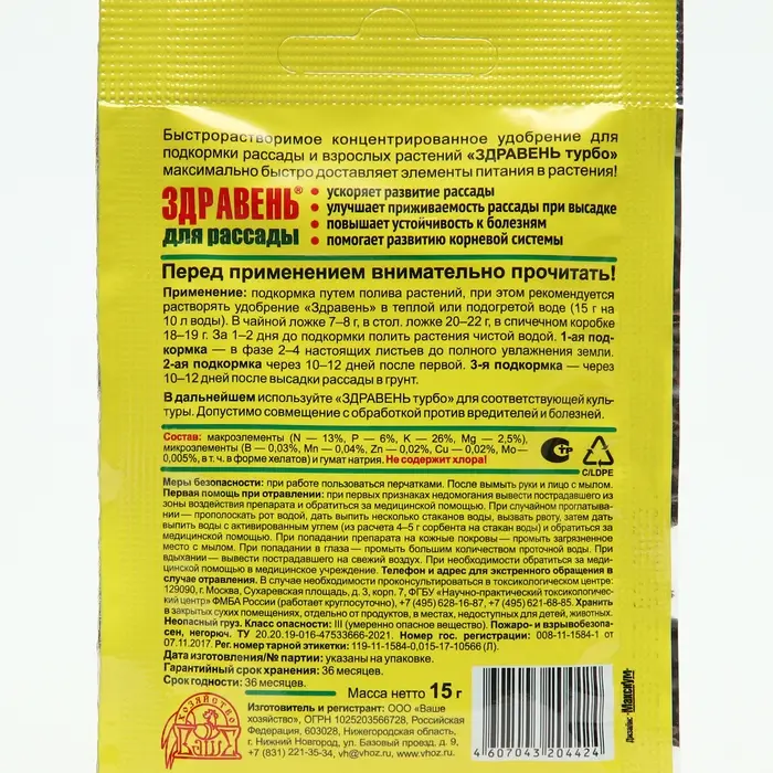 Удобрение "Здравень турбо" для рассады, 15 г
