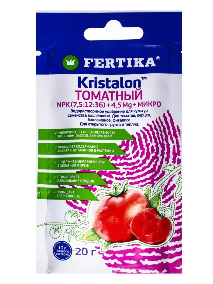 «Fertika Кристалон Томатный» — это полностью водорастворимое комплексное азотно-фосфорно-калийное удобрение с микроэлементами. Оно применяется в виде раствора в течение периода вегетации.