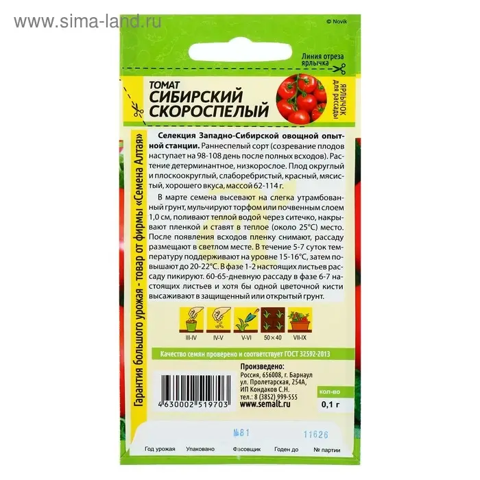 Семена Томат "Сибирский Скороспелый", цп,детерминантный,низкорослый, 0,1 г.