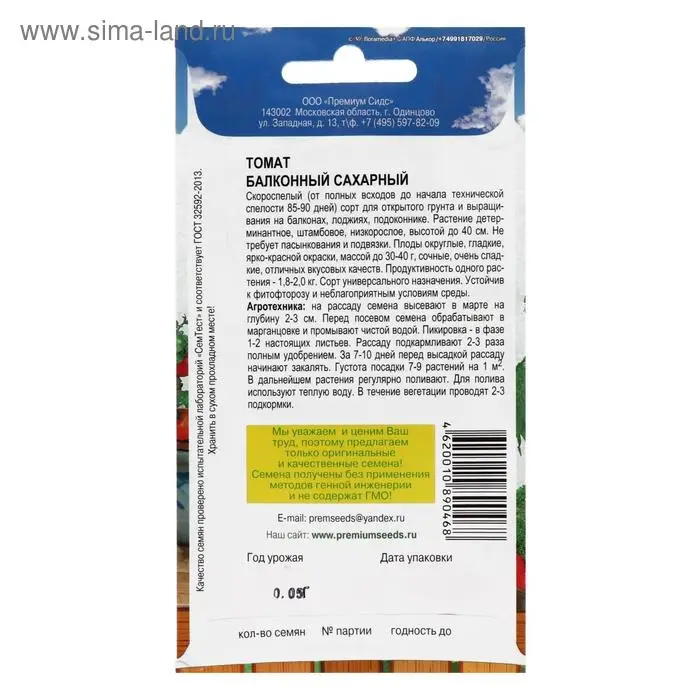 Семена Томат "Балконный сахарный", скороспелый, детерминантный,низкорослый 0,05 гр