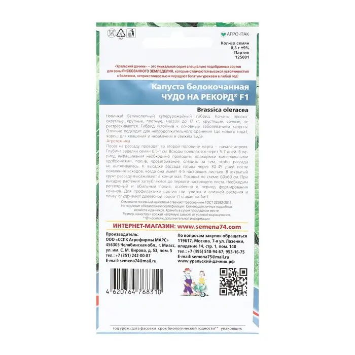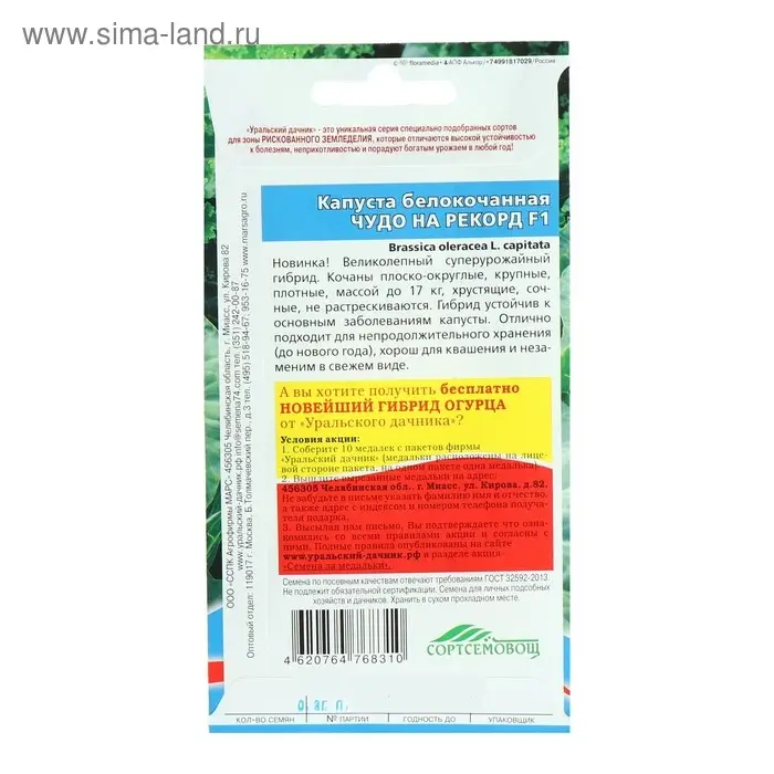 Семена Капусты белокочанной "Чудо на рекорд" F1 позднеспелый,крупнокочанный, 0,3 г