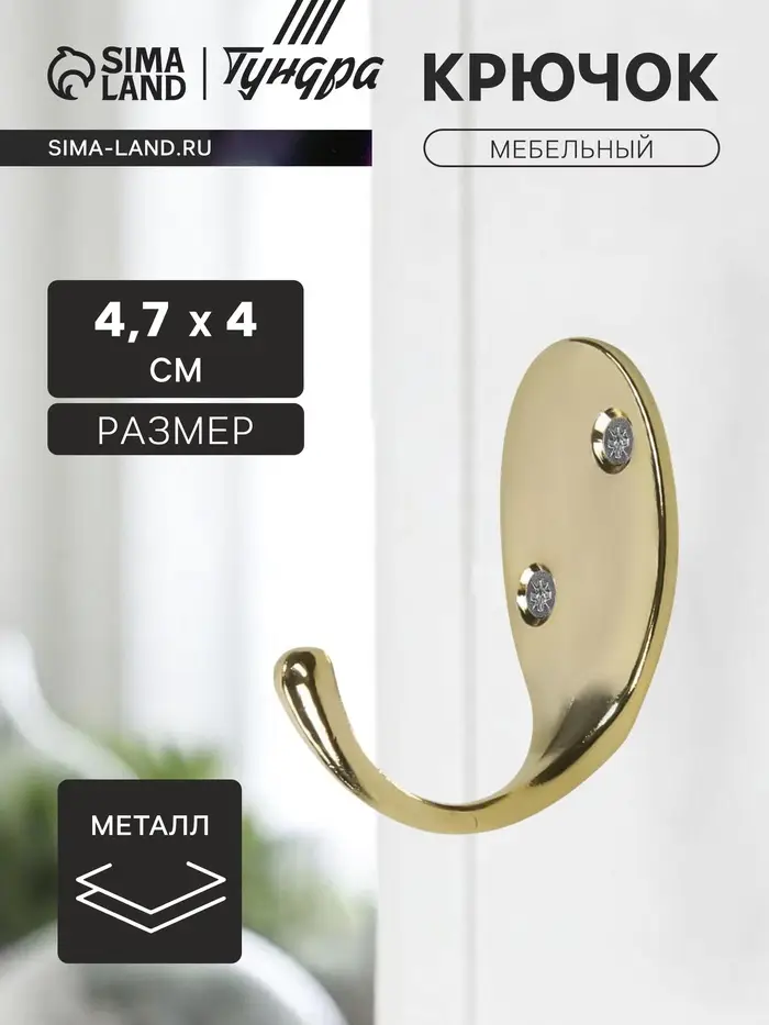 Крючок мебельный ТУНДРА TKO004, однорожковый, золото, 10 шт.