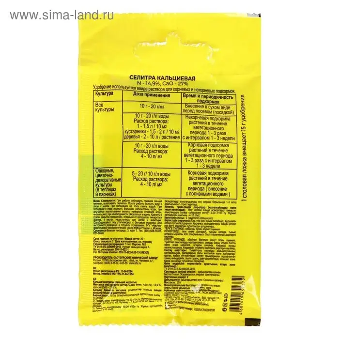 «Селитра кальциевая» — это комплексное минеральное удобрение для подкормок овощных, плодовых, цветочных и декоративных культур. В его состав входят кальций (27 %) и азот (14,9 %). Средство представляет собой полусферические гранулы белого и желтоватого цвета.