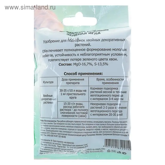 Водорастворимое удобрение предназначено для жидких подкормок хвойных растений. Средство устраняет побурение хвои, вызванное недостатком магния, и обеспечивает его профилактику.