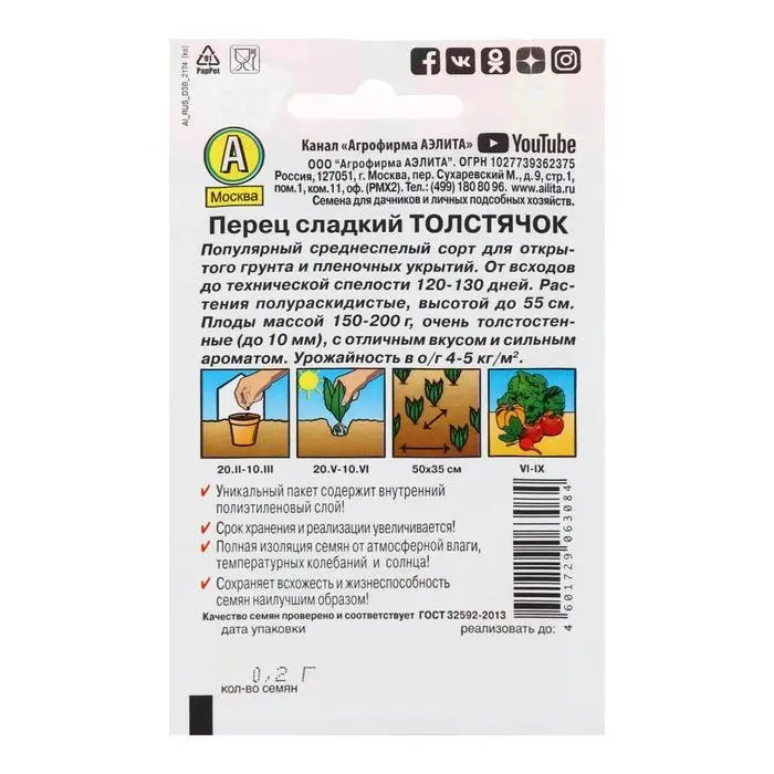 Благодаря внутреннему полиэтиленовому слою пакет не пропускает влагу и увеличивает срок годности семян до 2 лет.