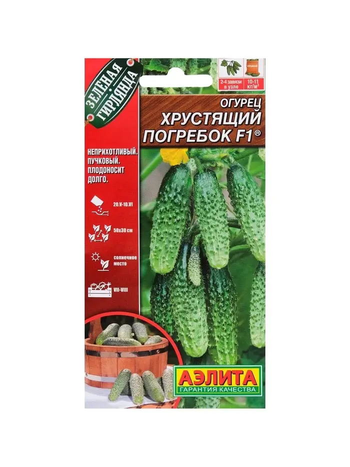 «Хрустящий погребок» — среднеранний гибридный сорт огурцов женского типа цветения. Устойчив к болезням культуры. Предназначен для открытого грунта и плёночных укрытий. Растение формирует бугорчатые белошипые плоды с насыщенным вкусом без горечи и пустот.