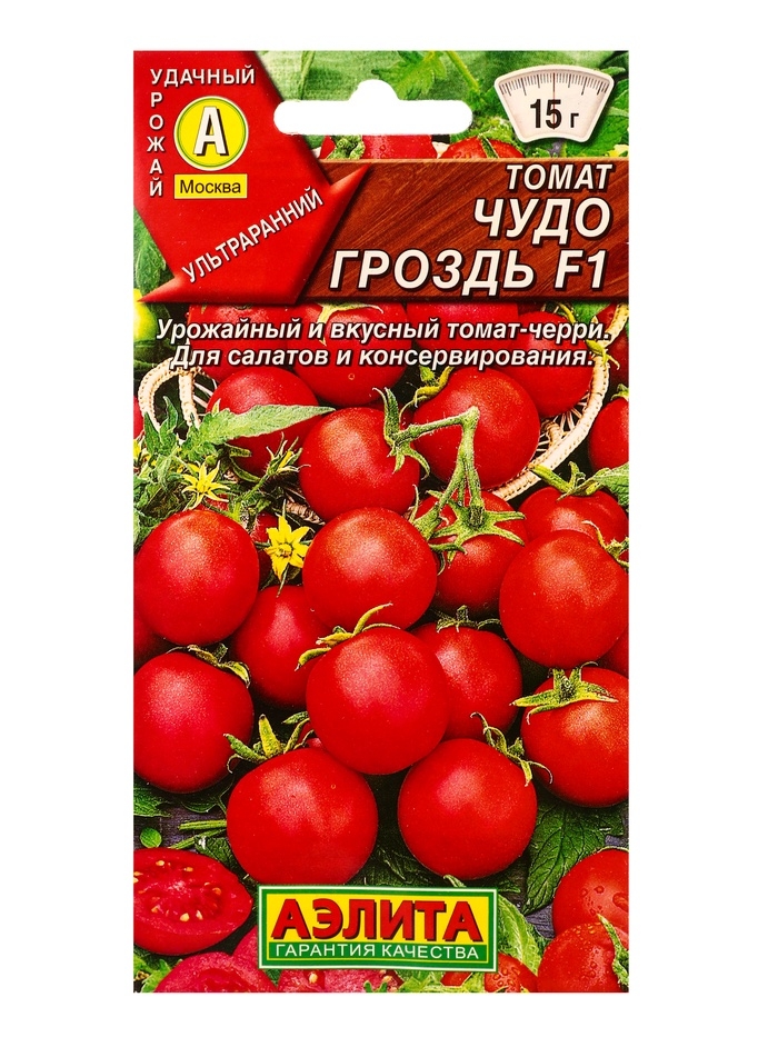 «Чудо-гроздь F1» — ультраранний гибридный сорт томата черри. Растение формирует сладкие, сочные плоды с приятным ароматом. Предназначено для выращивания в теплицах и открытом грунте.