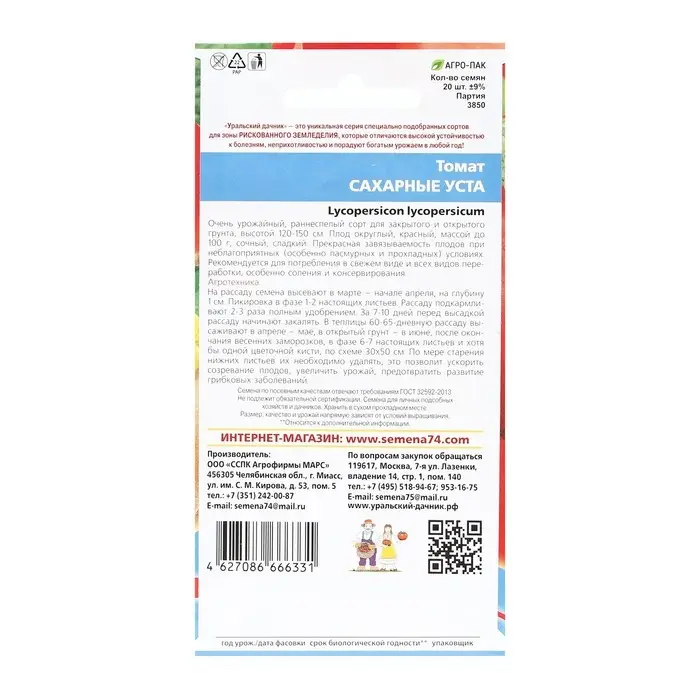 Семена Томат "Сахарные Уста" раннеспелый сорт для закрытого и открытого грунта 20 шт.