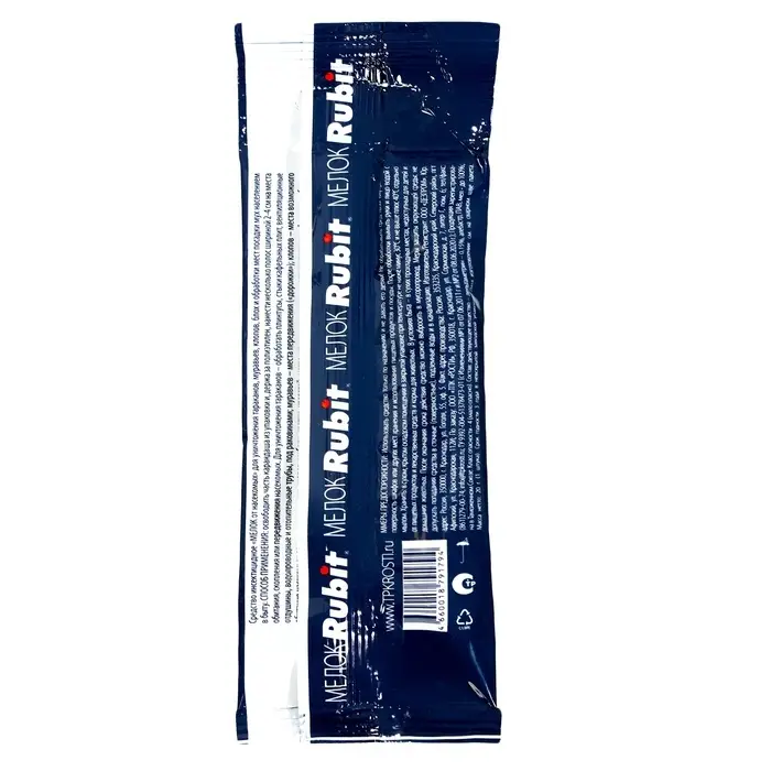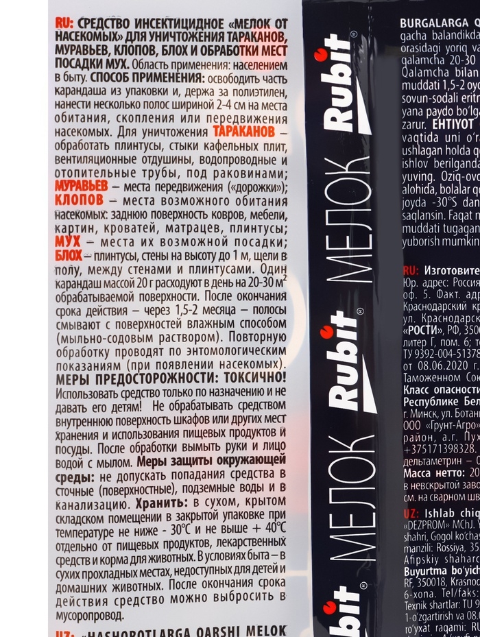 Мелок для защиты от насекомых «Рубит» — бытовое инсектицидное средство для уничтожения ползающих насекомых и отпугивания мух в помещении. Наносится на все поверхности в местах присутствия насекомых, их передвижения или возможного появления: полы и стены, плинтуса, мебель, трубы, стыки отделочных материалов. Мелок эффективен в борьбе с тараканами, муравьями, клопами и блохами. Упаковка рассчитана на обработку площади до 30 м².Простое в использовании и экономичное средство.Незаметен на светлых поверхностях.Состав Действующее вещество: дельтаметрин 0,15%. Легко смывается мыльным раствором.Способ применения Освободить часть мелка из упаковки. Держа за полиэтилен, нанести несколько полос в местах скопления, обитания и передвижения насекомых. Например:мухи – любые места возможной посадки;муравьи – пути передвижения («дорожки»);клопы – задняя поверхность ковров, мебели, картин, плинтуса и т.д.;блохи – плинтусы, стены на высоту до 1 м, щели в полу, пространство между плинтусами;тараканы – плинтусы, стыки кафельных плит, пространство под раковиной, вентиляционные отдушины, водопроводные и отопительные трубы.Норма расхода: 1 мелок/20-30 м2. Повторные обработки проводятся при появлении вредителей.