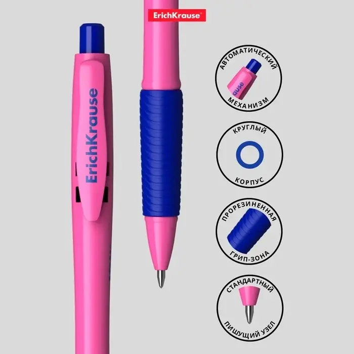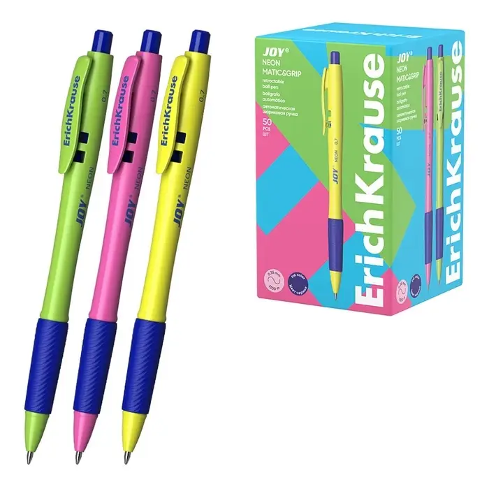 Ручка шариковая автоматическая ErichKrause JOY Neon, узел 0.7 мм, чернила синие, резиновый держатель, супермягкое письмо, длина линии письма 1300 метров, МИКС