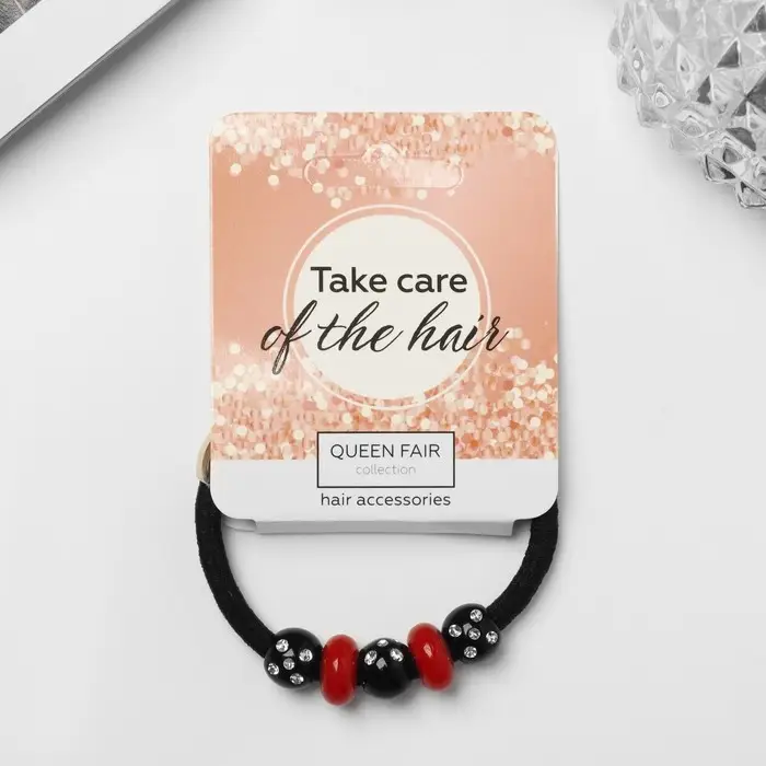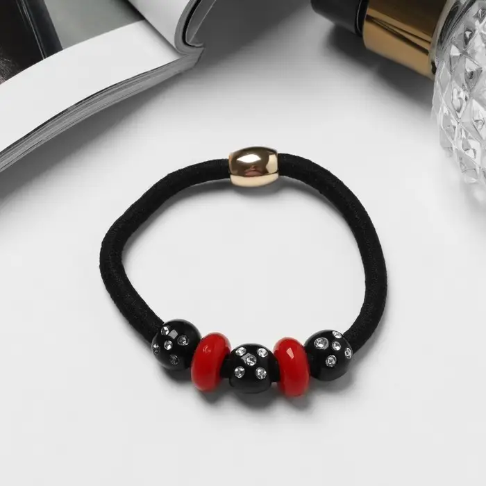 Эта чёрная резинка с декором в виде шариков — простой способ добавить образу игривости и цвета. Она крепко держит волосы, не путается и не оставляет заломов. Чёрный и красный — классическое сочетание, которое подходит к любой одежде и настроению.
