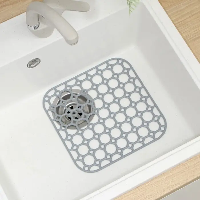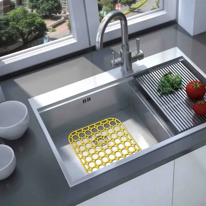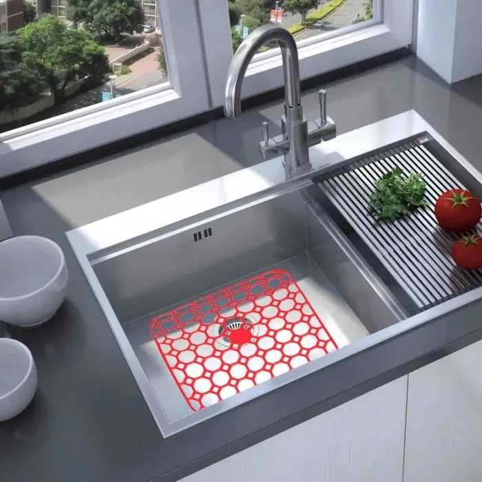 Решётка для мойки защитит раковину от загрязнений, остатков пищи и засоров. Обеспечит мягкую прослойку между раковиной и посудой, сохраняя хрупкую посуду от сколов, а раковину — от царапин кухонными принадлежностями.