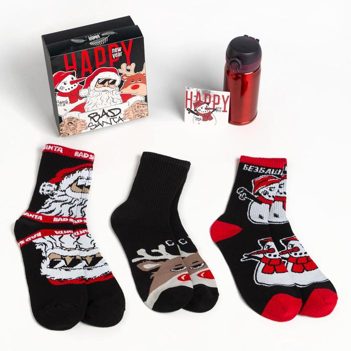Новогодний подарочный набор термос и носки 3 пары KAFTAN Bad Santa, размер 41-44 (27-29 см)