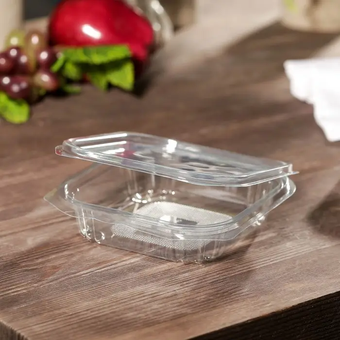 Изготовленный из качественного пластика, этот одноразовый контейнер позволяет видеть содержимое, а неразъемная крышка упрощает использование. Контейнер пластиковый идеально подходит для небольших порций. Несмотря на отсутствие герметичности, крышка надежно закрывается.
