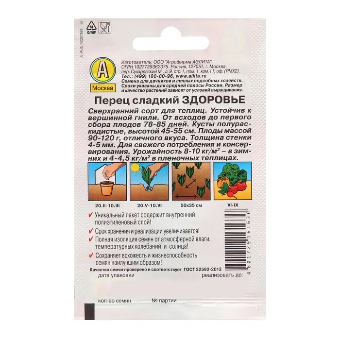 Благодаря внутреннему полиэтиленовому слою пакет не пропускает влагу и увеличивает срок годности семян до 2 лет.