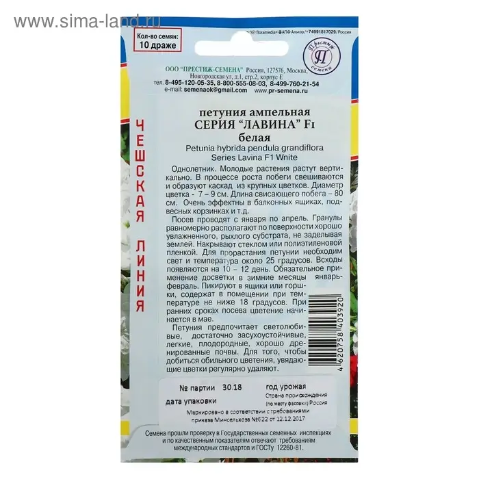 Семена цветов Петуния ампельная крупноцветковая "Лавина" Белая F1, О, драже 10 шт
