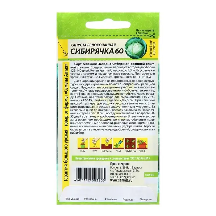 Семена Капусты белокочанной "Сибирячка 60", цп, 0,5 г