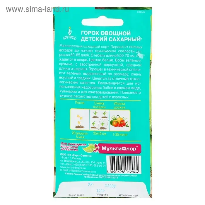 Семена Горох "Детский" сахарный, раннеспелый, низкорослый, 10 г