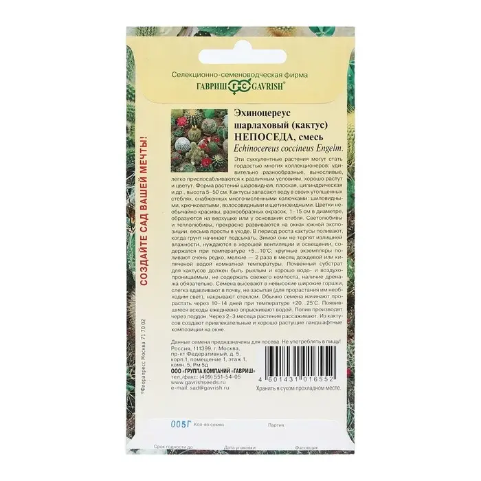 Семена комнатных цветов Кактус "Непоседа", ц/п, 0,05 г