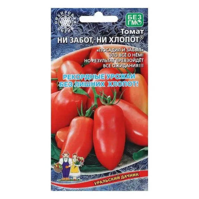 Ультраскороспелый сорт для открытого грунта. Растение высотой 40-45 см, не требует пасынкования и подвязки. Плоды красные, мясистые, удлинённо-овальные, с носиком, гладкие, массой 50-60 г. Сорт особенно рекомендуется для начинающих огородников, так как растения не требуют сложного ухода.