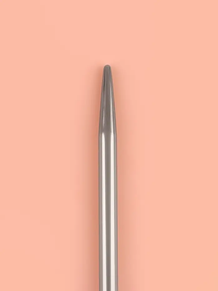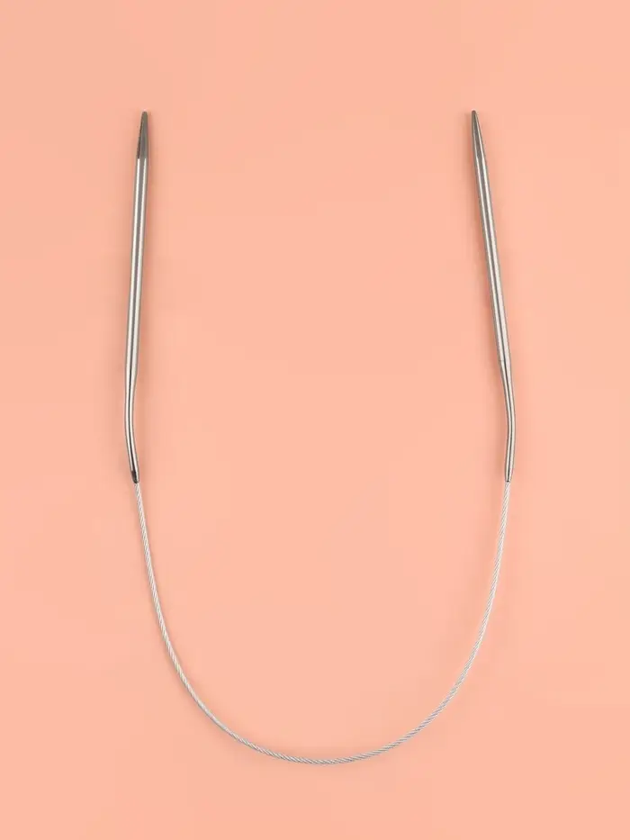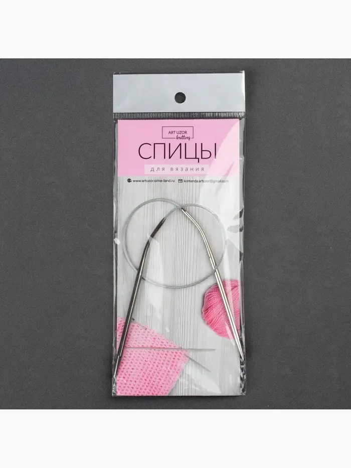 Круговые спицы представляют собой две металлические части, соединённые друг с другом тросиком. Инструмент незаменим при вязании полотна по кругу. С его помощью получаются изделия без дополнительных швов: шапки, рукава и горловины.