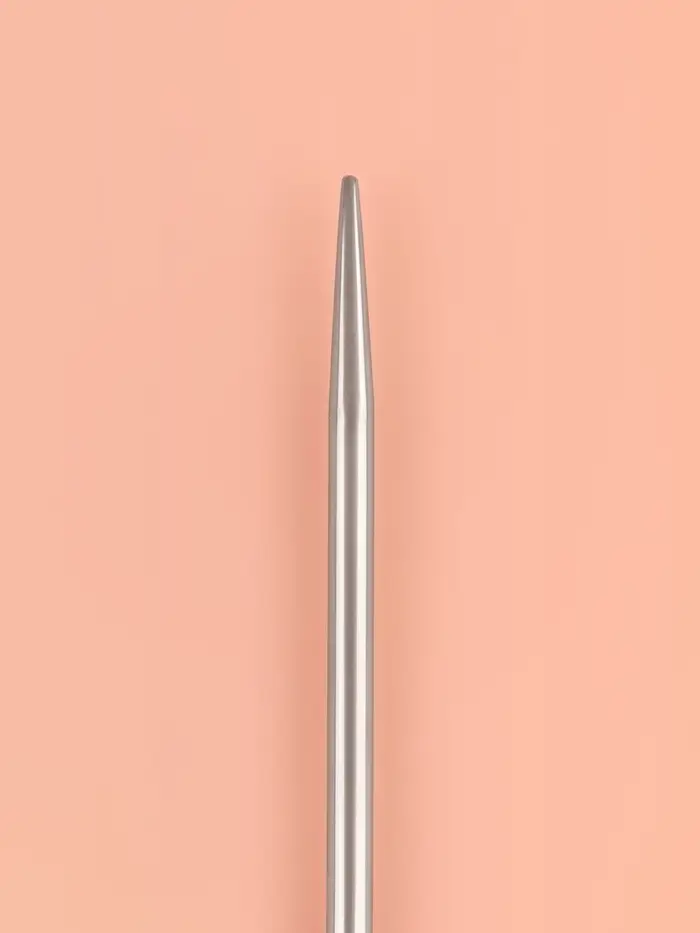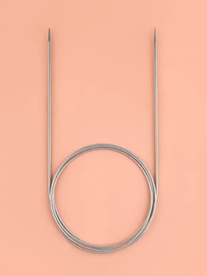 Круговые спицы представляют собой две металлические части, соединённые друг с другом тросиком. Инструмент незаменим при вязании полотна по кругу. С его помощью получаются изделия без дополнительных швов: шапки, рукава и горловины.