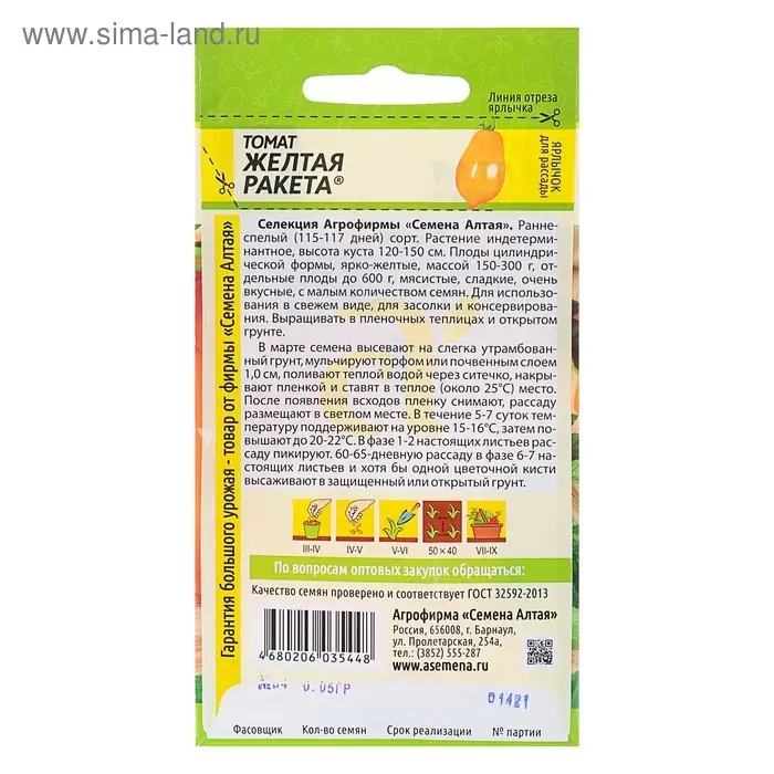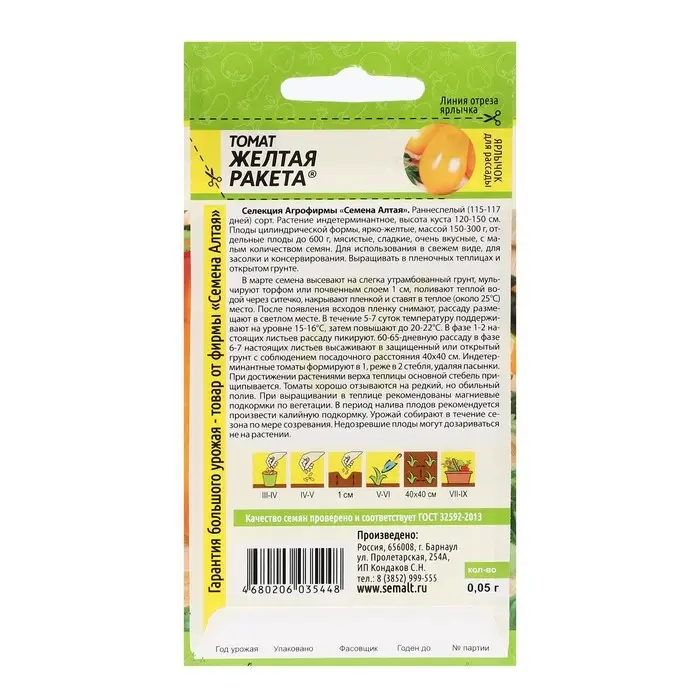 Семена Томат "Желтая Ракета" раннеспелый, цп,индетерминантный,высокорослый, 0,05 г