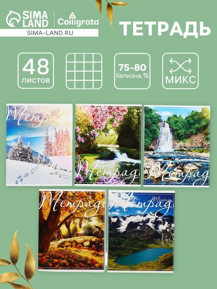 Тетрадь 48 листов в клетку Calligrata «Пейзаж», обложка мелованный картон, блок №2, белизна 75% (серые листы), МИКС