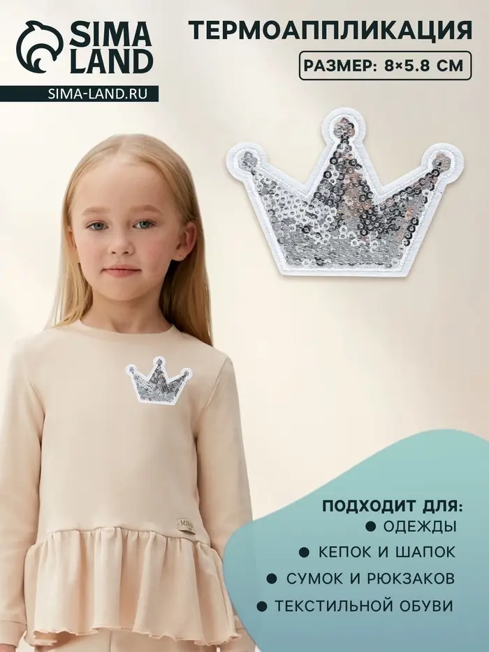 Термоаппликация «Корона» представляет собой яркий текстильный элемент с пайетками, который можно легко закрепить на ткани при помощи утюга. Она станет отличным решением для украшения одежды, аксессуаров и других тканевых предметов. Изображение короны придётся по душе истинным королевам и принцессам