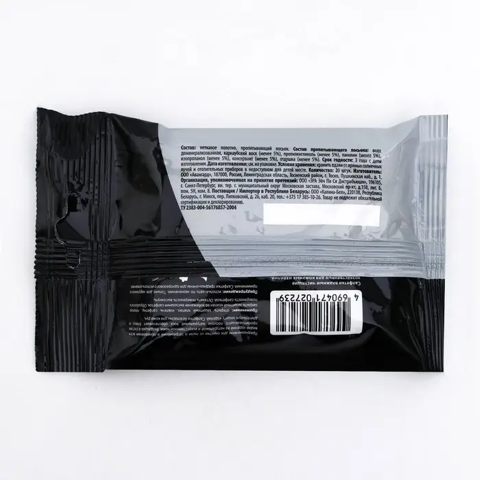 Состав: нетканое полотно, пропитывающий лосьон (вода деминерализованная, карнауский воск 5%, пропиленгликоль 5%, ланолин 5%, изопрапанол 5%, консервант 5%, отдушка 5%).