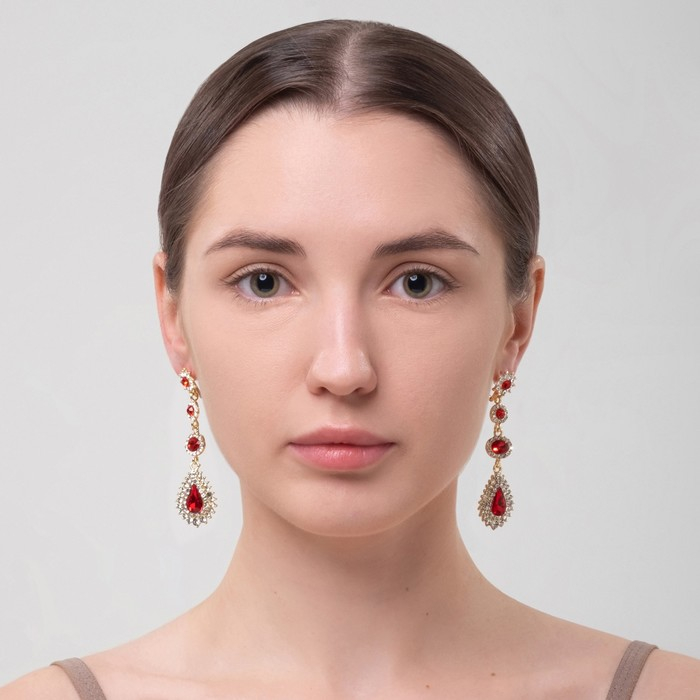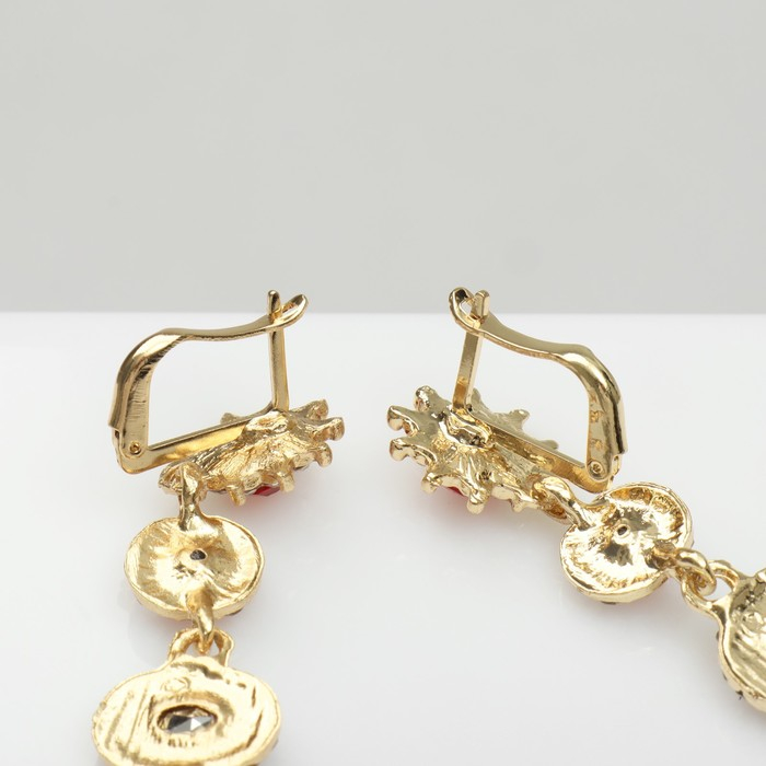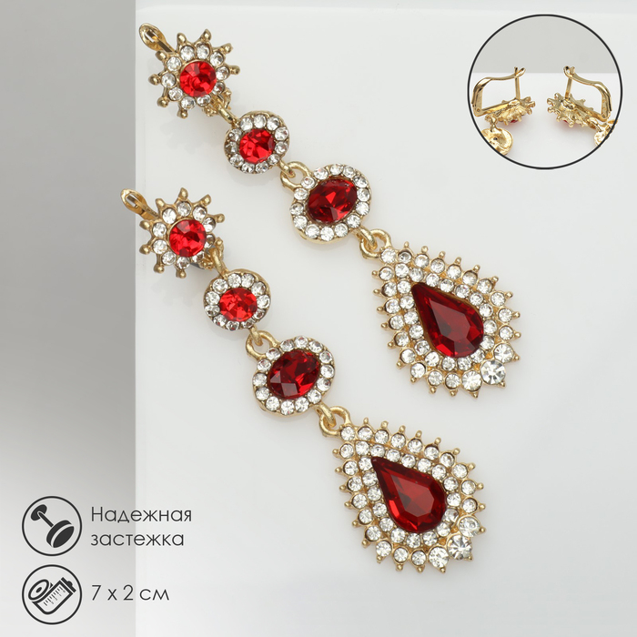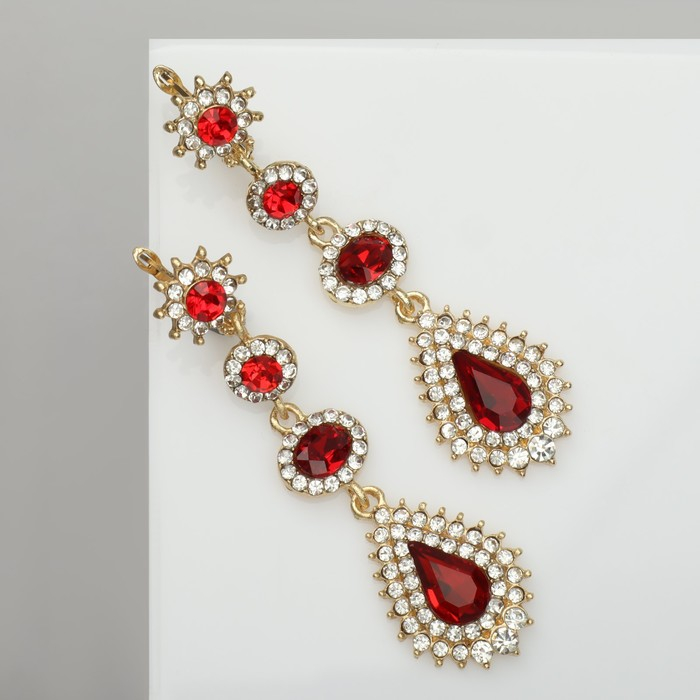Серьги висячие со стразами «Вечерние» мадам, цвет бело-красный в золоте, 7 см