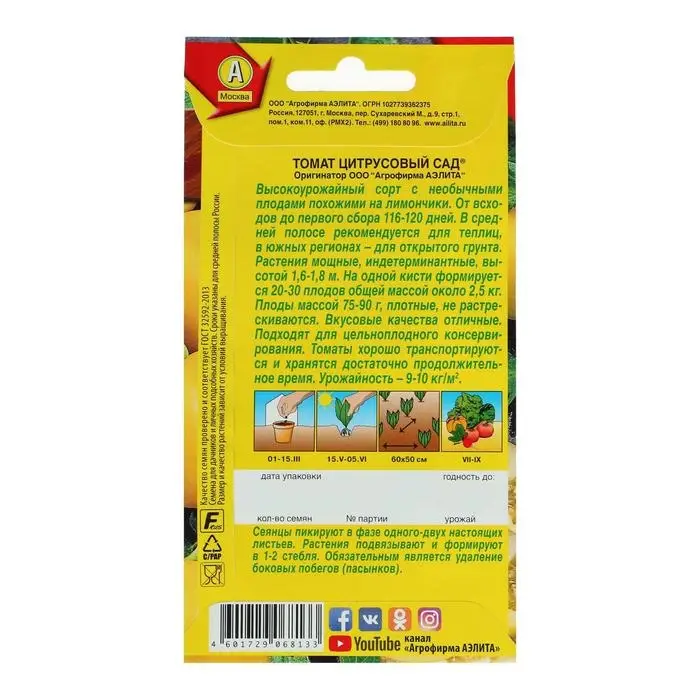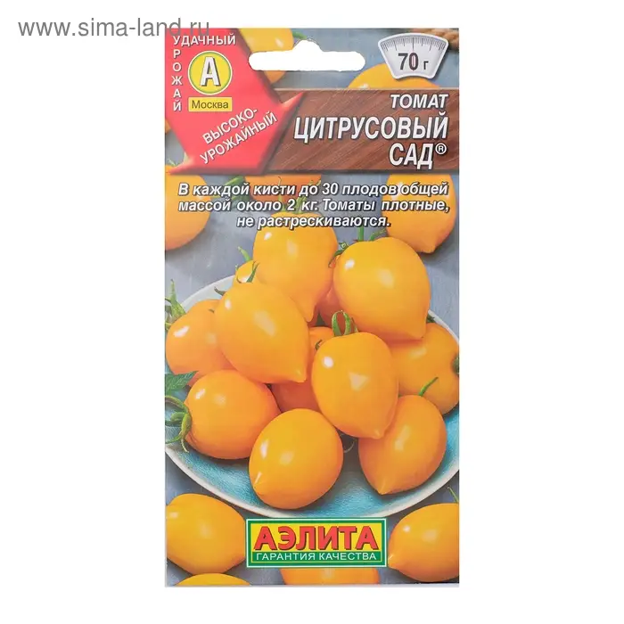Высокоурожайный сорт с необычными плодами похожими на лимончики. От всходов до первого сбора 116-120 дней. В средней полосе рекомендуется для теплиц, в южных регионах – для открытого грунта. Растения мощные, индетерминантные, высотой 1,6-1,8 м. На одной кисти формируется до 30 плодов общей массой около 2 кг. Плоды массой 50-70 г, плотные, не растрескиваются. Вкусовые качества хорошие. Подходят для цельноплодного консервирования. Томаты хорошо транспортируются и хранятся достаточно продолжительное время. Урожайность очень высокая.