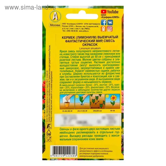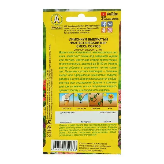 Яркая смесь популярного неприхотливого летника, известного так же под названием лимониум или статице. Стебли высотой до 60 см с прикорневой розеткой листьев. Мелкие цветки собраны в элегантные густые соцветия. Растения достаточно холодостойкие (могут выносить кратковременные заморозки), засухоустойчивые и крайне светолюбивые. Украсят каменистые садики, рабатки и клумбы. Широко используются во флористике при составлении букетов и композиций, как в свежем, так и в засушенном виде. В высушенном виде сохраняют форму и насыщенность окраски.