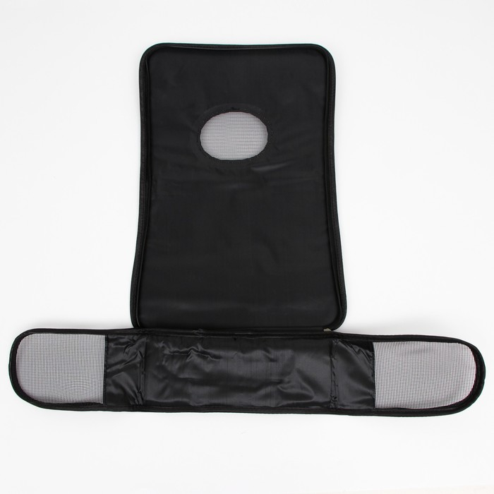 В дно переноски вшит плотный картон, который обеспечивает твердую основу и защищает животное от вибраций и ударов. Прозрачная сетка позволяет питомцу наблюдать за окружающим миром и получать достаточно свежего воздуха.