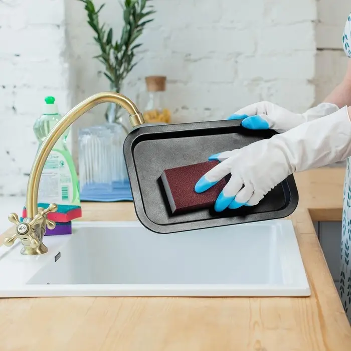 - Эффективность: специальная структура абразива оттирает даже самые трудные пятна, делая уборку легкой и быстрой.