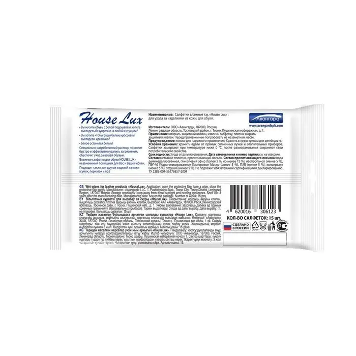 Влажные салфетки House Lux, для обуви, 15 шт.