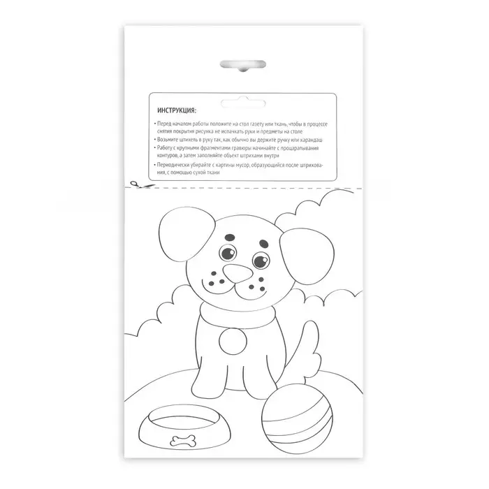 В наборе есть многослойное панно, покрытое чёрной краской, на которое нанесён контур рисунка. С помощью штихеля, который входит в набор, путём процарапывания создаётся гравюра.