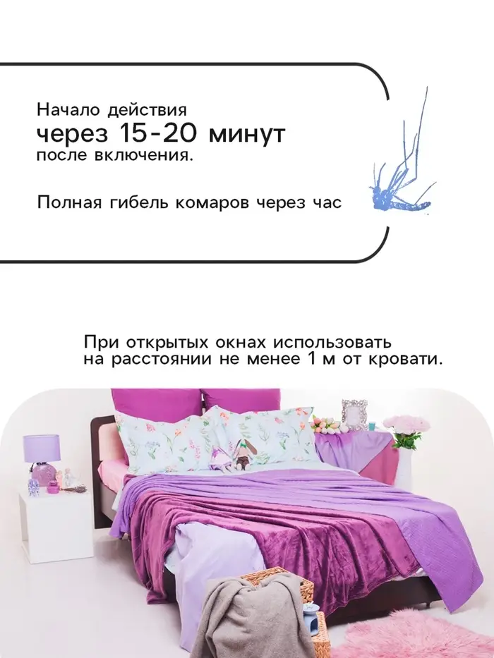 Для уничтожения кровососущих комаров, москитов, мокрецов, мошек в закрытых или хорошо проветриваемых помещениях. Способ применения: Вскрыть упаковку, достать пластину и поместить на нагревательную поверхность электрофумигатора. Включить в сеть так, чтобы он находился в вертикальном положении. Средство начинает действовать, через 10-20 минут после включения, обеспечивая гипель комаров в помещении 10-20 кв.м. через 20-60 минут после включения, в зависимости от объема помещения, температуры воздуха, вентиляции. Состав: трансфлутрин, красители, растворитель