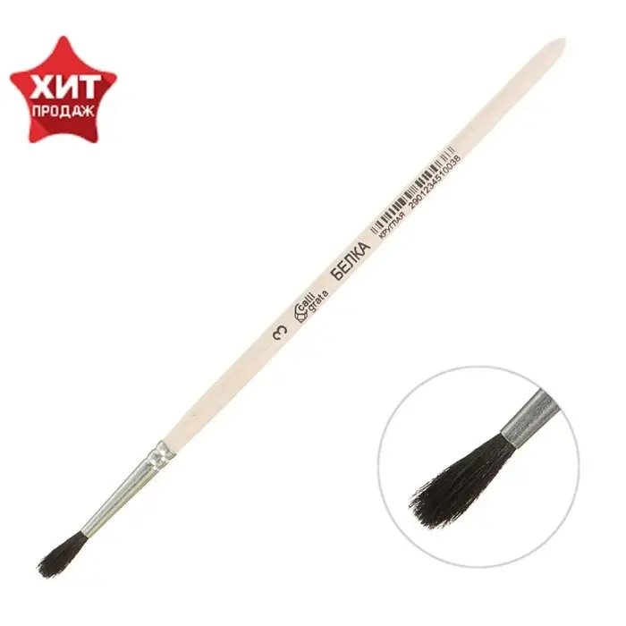 Кисть для рисования, Белка круглая № 3 (диаметр обоймы 3 мм; длина волоса 16 мм), деревянная ручка, Calligrata