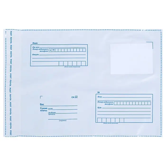 Пакет имеет размер 250х353 мм. Достаточно плотный и его содержимое не просматривается. Такой пакет особо прочен по сравнению с бумажными конвертами. Пластиковые пакеты соответствуют Техническим Условиям (ТУ) Почты России 2015 года и ПОУПС (Правилам оказания услуг Почтовой Связи) от 23 января 2015 год и принимаются во всех отделениях Почты России.