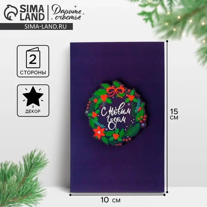 Открытка с новым годом, с деревянным элементом «С Новым годом!» венок, 10 х 15 см