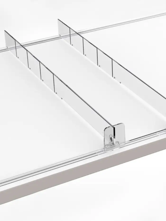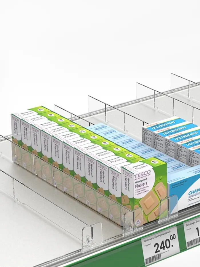 Пластиковый разделитель высотой 30 мм имеет передний Т-ограничитель высотой 35 мм. Идеальное решение для организации выкладки сигарет, лекарств, парфюмерии.