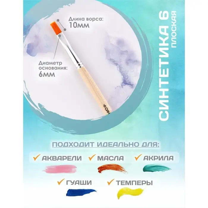 Синтетический волос имеет гладкую структуру и обладает капиллярным эффектом, что позволяет использовать такие кисти при работе с акварелью, гуашью, темперой, акрилом и маслом.