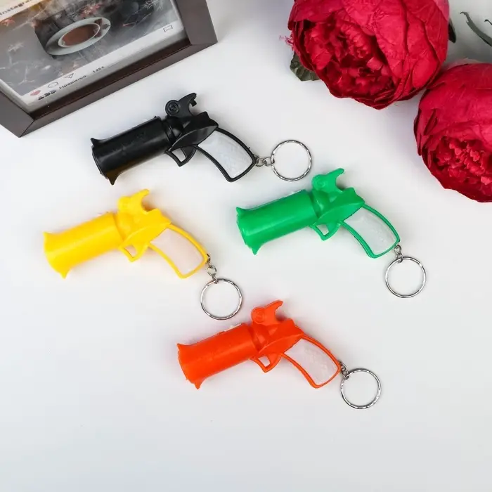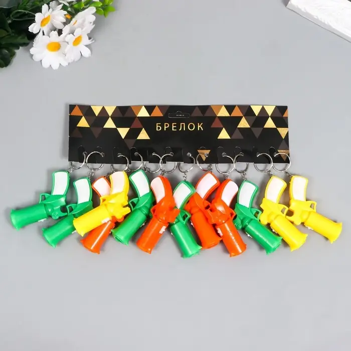- Оригинальный дизайн: Брелок выполнен в виде стилизованного пистолета, что делает его уникальным аксессуаром.