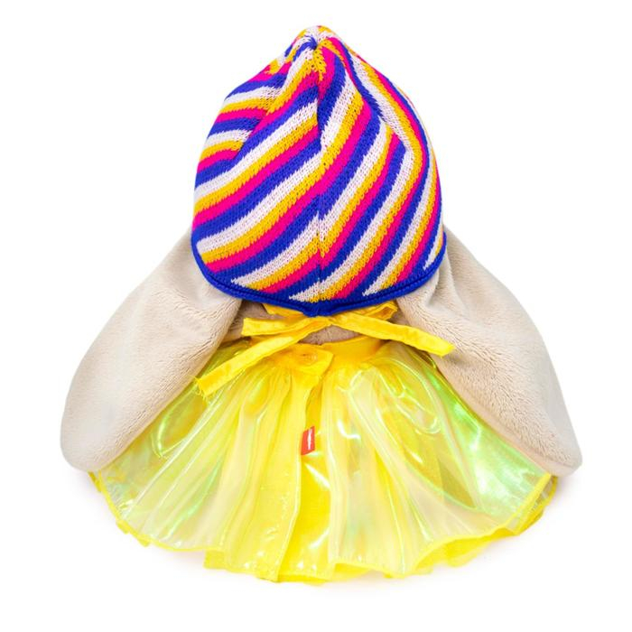 - На зайке платье цвета лимонада, сшитое из тканей компаньонов и украшено розовым бантиком. Также в комплекте необычная вязаная шапочка, связанная диагональными яркими полосами из мягкого акрила. Шапочка украшена крупными блестящими пайетками.