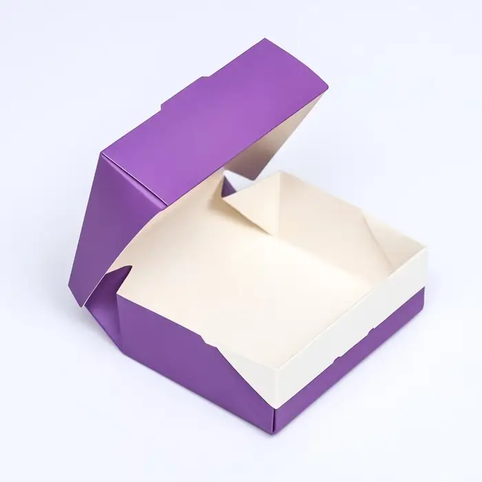 Коробка с откидывающейся крышкой для упаковки невысоких тортиков, пирожных и выпечки, а также сувениров и подарков полностью ламинирован изнутри.
