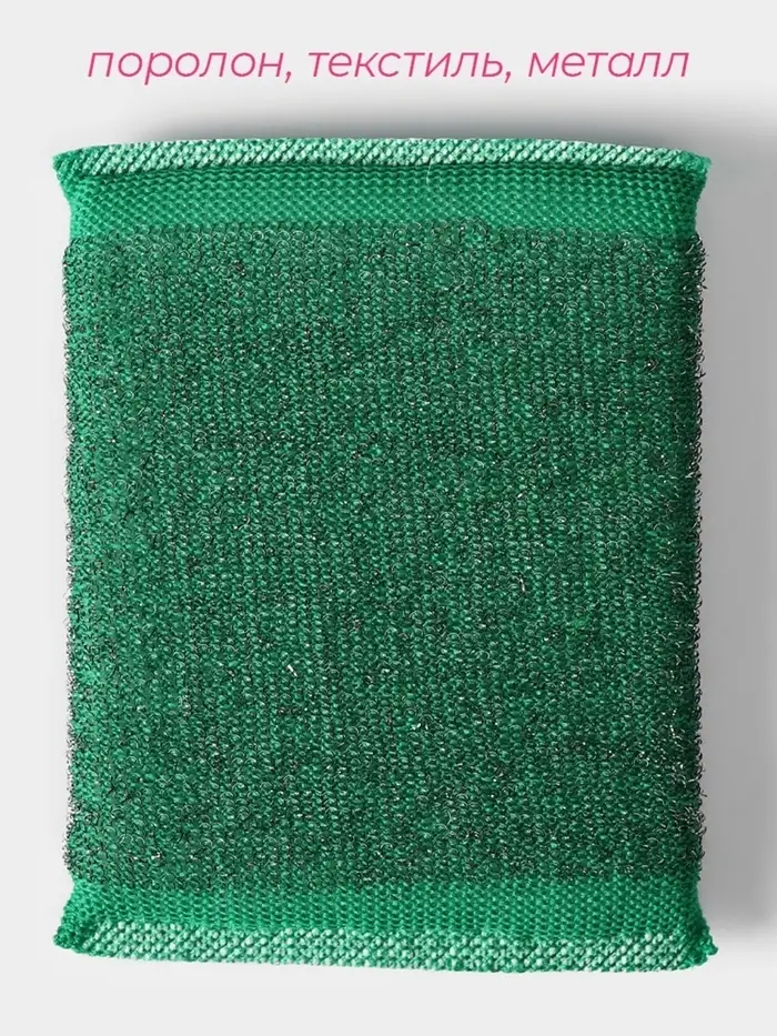 Благодаря уникальному сочетанию материалов — металл, текстиль и поролон — губка обеспечивает максимальную эффективность при минимальных усилиях. Металлическая стружка легко справляется с пригоревшими остатками пищи и жиром, а текстильная основа гарантирует мягкость и бережное отношение к посуде.