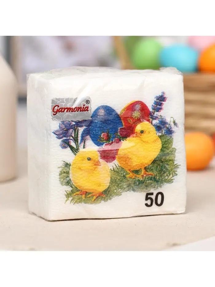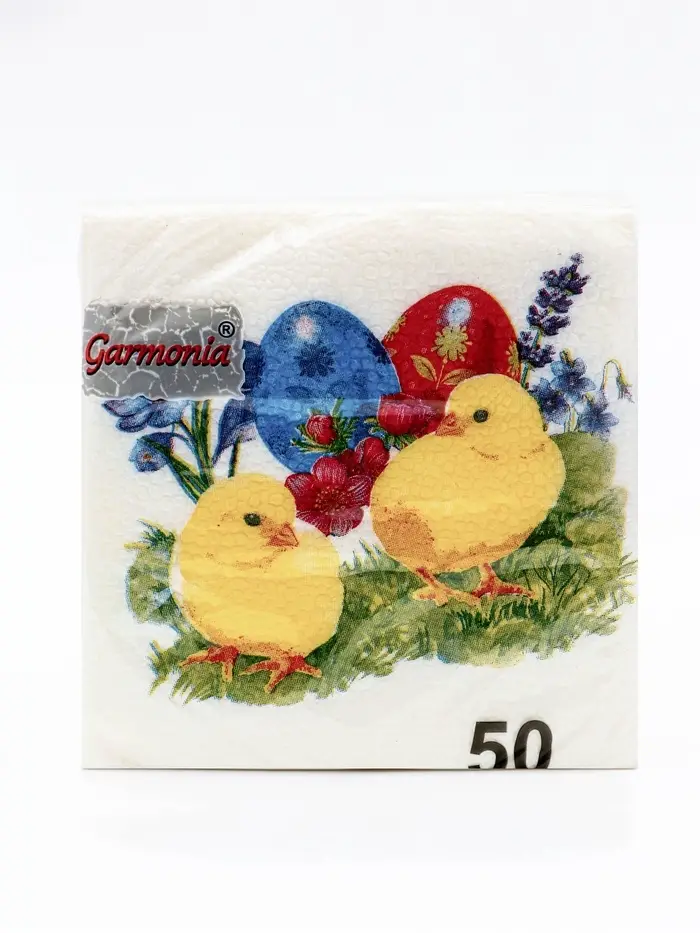 Пасхальные сервировочные бумажные салфетки Гармония цвета с рисунком «Цыплята» - это отличное украшение для вашего праздничного стола. Идеально подойдут как для сервировки, так и в качестве декора и украшения в домашних условиях или на больших мероприятиях. Праздничные салфетки с пасхальным рисунком будут хорошим подарком для родных и близких. Данные салфетки можно использовать так же для декупажа и коллажей.