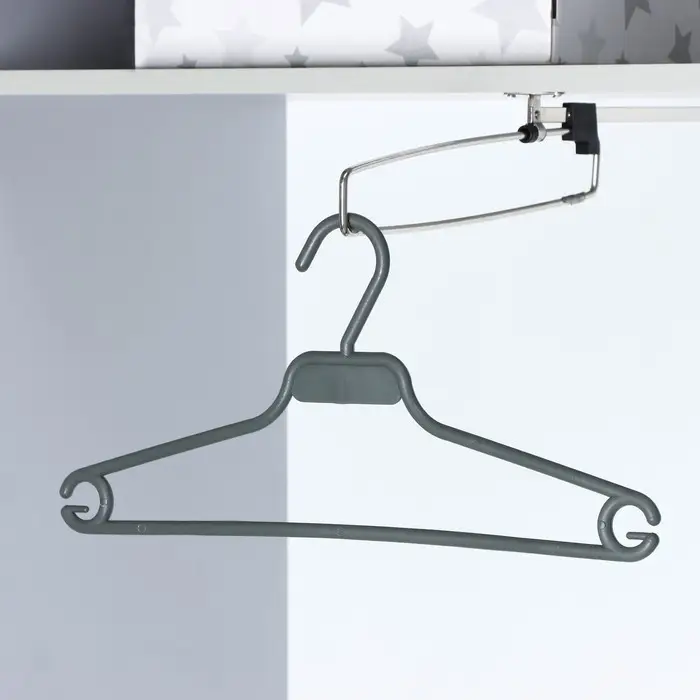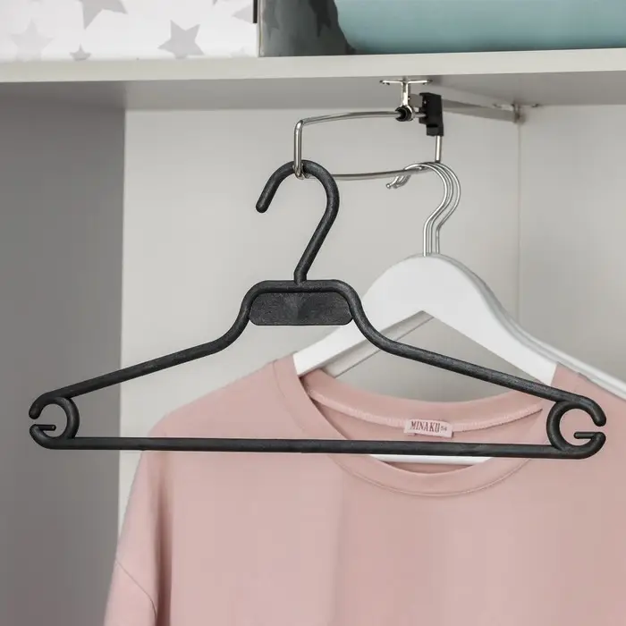 Вешалка – это компактное приспособление, которое позволит вам разместить в гардеробе классические штаны из лёгких или плотных материалов, блузки, рубашки, кофты и другие вещи. Изделие практичной формы занимает мало места, что позволяет экономить пространство в шкафу. Эргономичная форма поможет надёжно зафиксировать одежду и предотвратить её падение.
