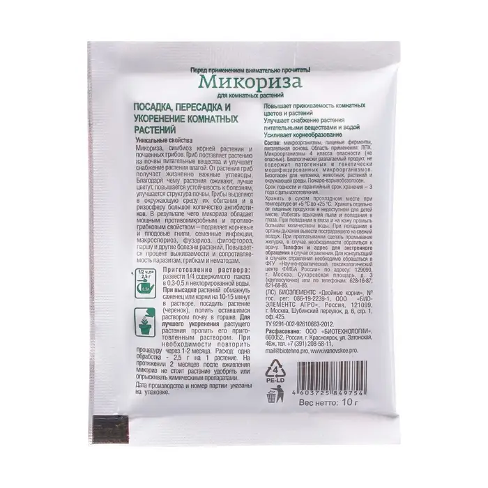 Микориза улучшает приживаемость комнатных цветов и растений, улучшает снабжение растения питательными веществами и водой, усиливает корнеобразование.